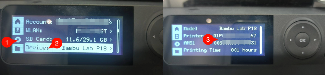 To find the printer name and serial number for Bambu P1P printers, follow the steps below.